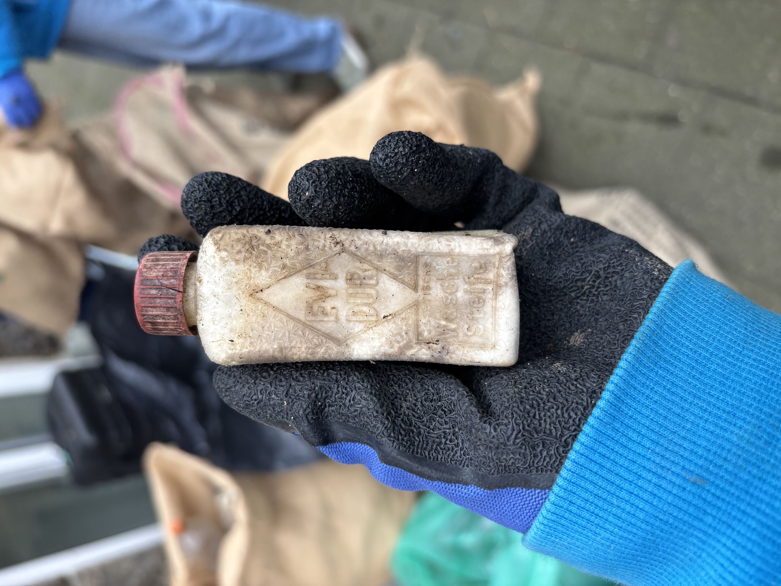 Ein weiteres außergewöhnliches Fundstück war eine noch vollständig erhaltene und gefüllte(!) Evidur-Wäschesteife-Flasche aus den 1960er-Jahren . Ähnliche Flaschen kennen wir bereits aus unserer Ausstellung „Zeit im Fluss“ – diese hier ist die erste komplett erhaltene ihrer Art.